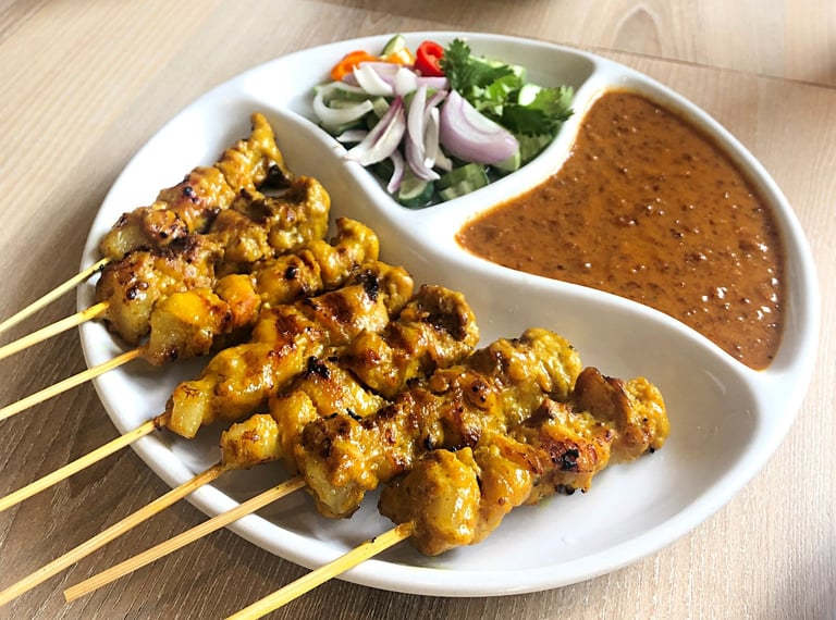 Restaurant signature juicy pork satay served with peanut sauce and cucumber salad